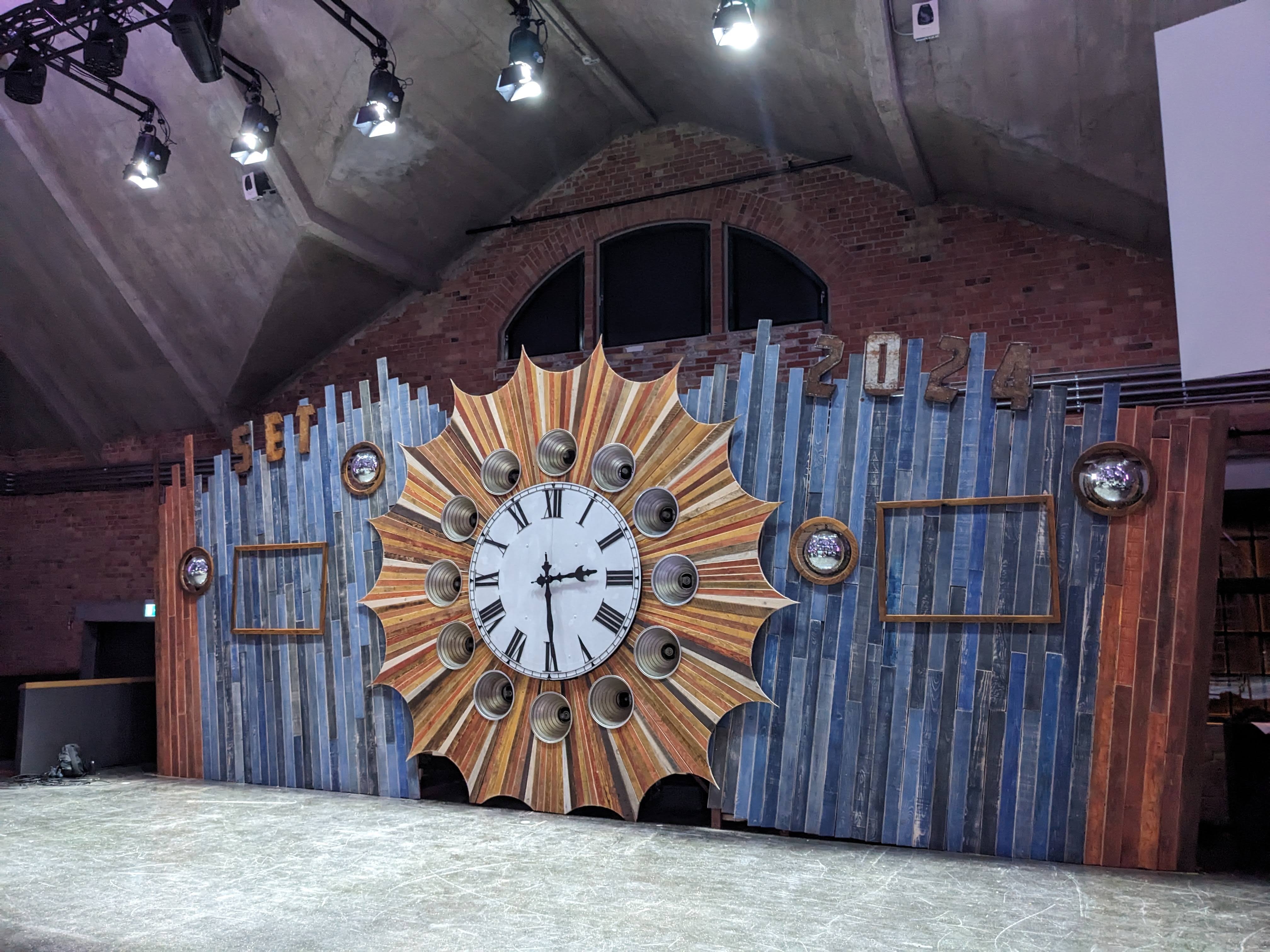 2024 hat es den Dachboden erstmalig auf eine Messe verschlagen. Start-Up Energy Transition (Set Tech) hat sich von uns eine Bühne im Festivalstil gewünscht. Dabei wurde die Bühne ausschließlich aus unseren nachhaltigen Lieblings Ressourcen erbaut - Rost und Holz. Um die Pitches der einzelnen Start Ups interaktiv zu gestalten, begannen die Zeiger unserer Strobo-Uhr sich wild zu drehen, sobald die Zeit knapp wurde. Um der Uhr einen für das Event angemessenen Rahmen zu schaffen, entstand hier erstmalig unsere Sonne. Diese hat auch noch nachhaltig, mitunter auch auf dem Wüst und Wild-Festival, für gute Stimmung gesorgt!