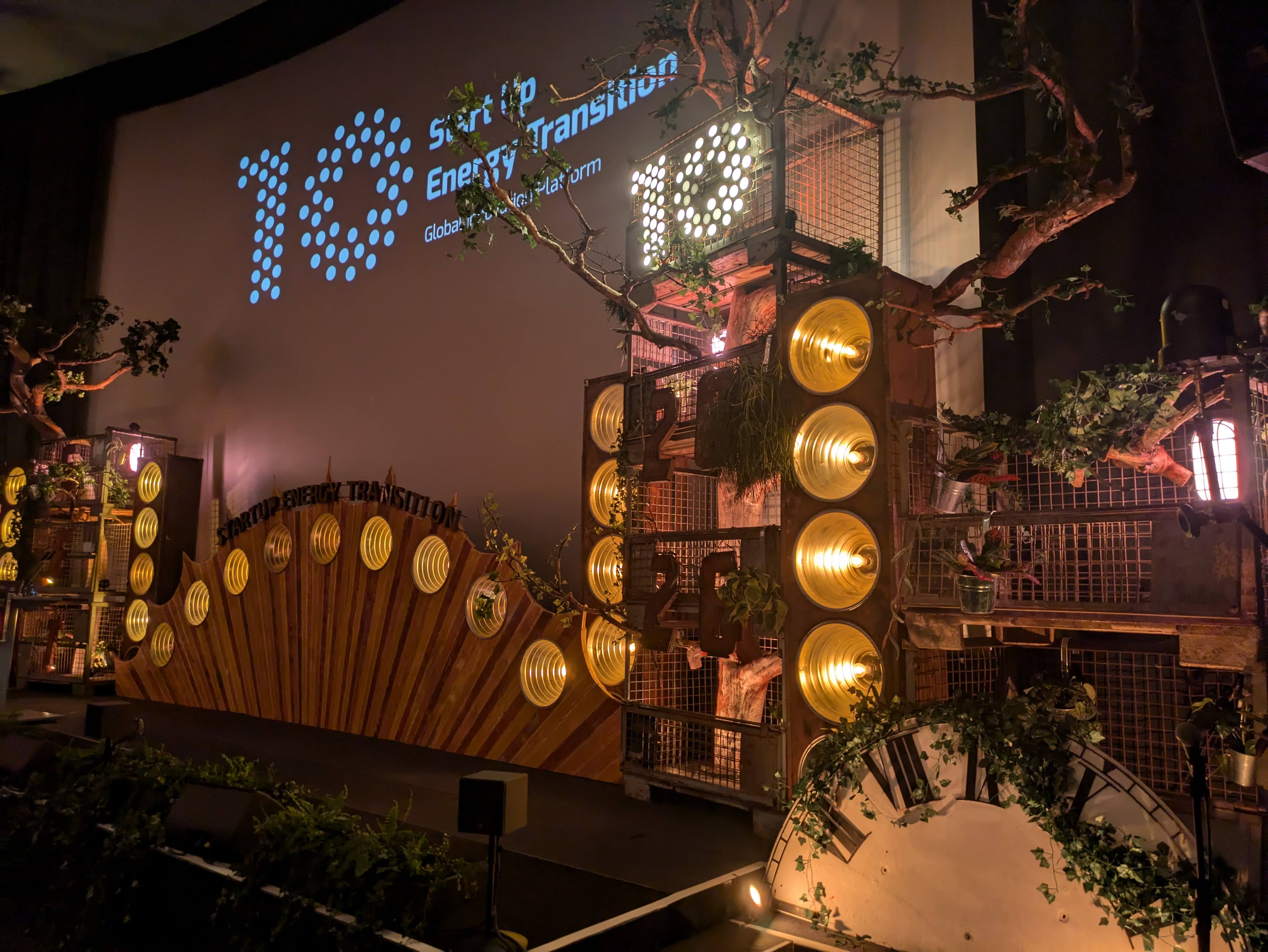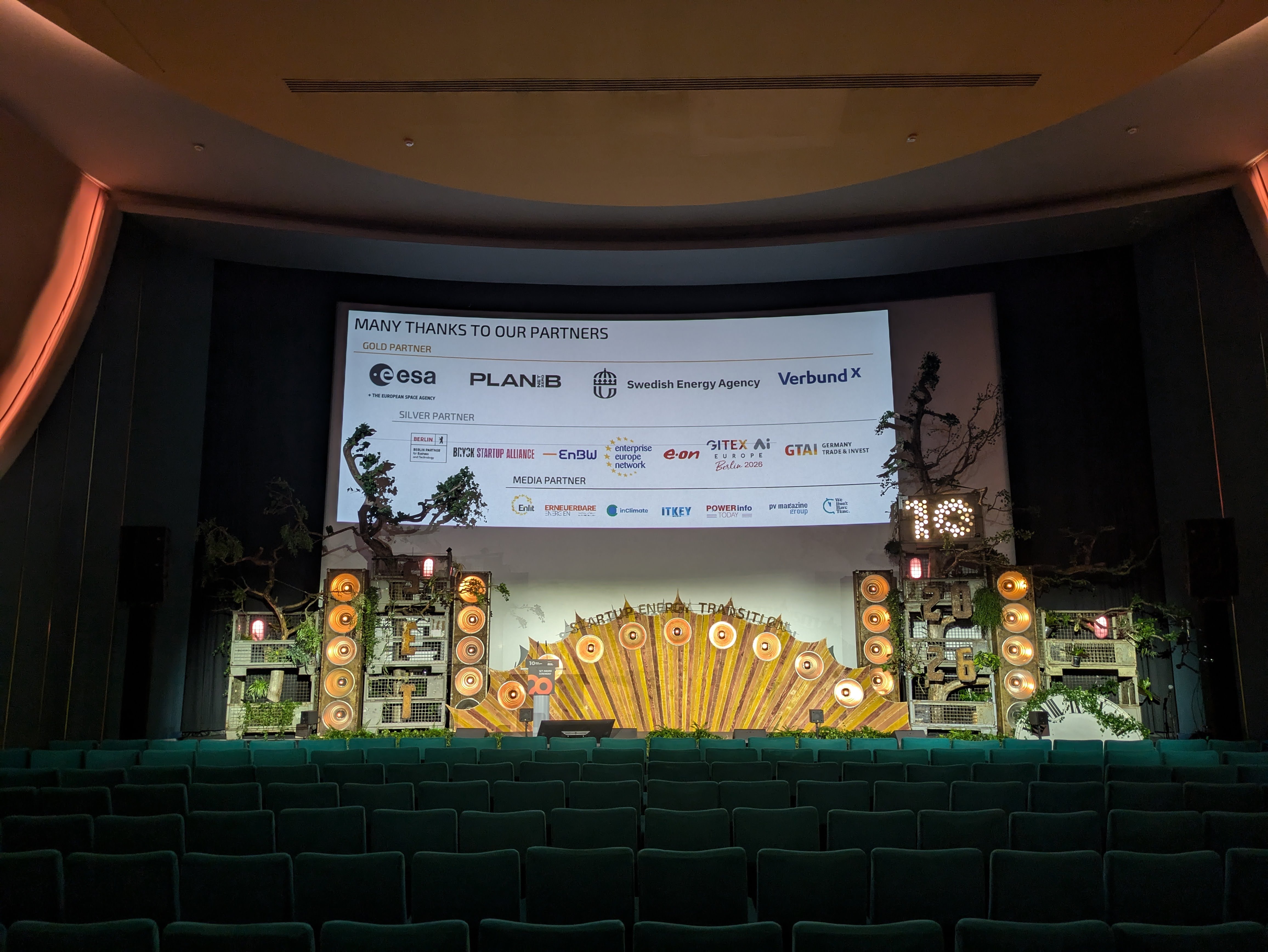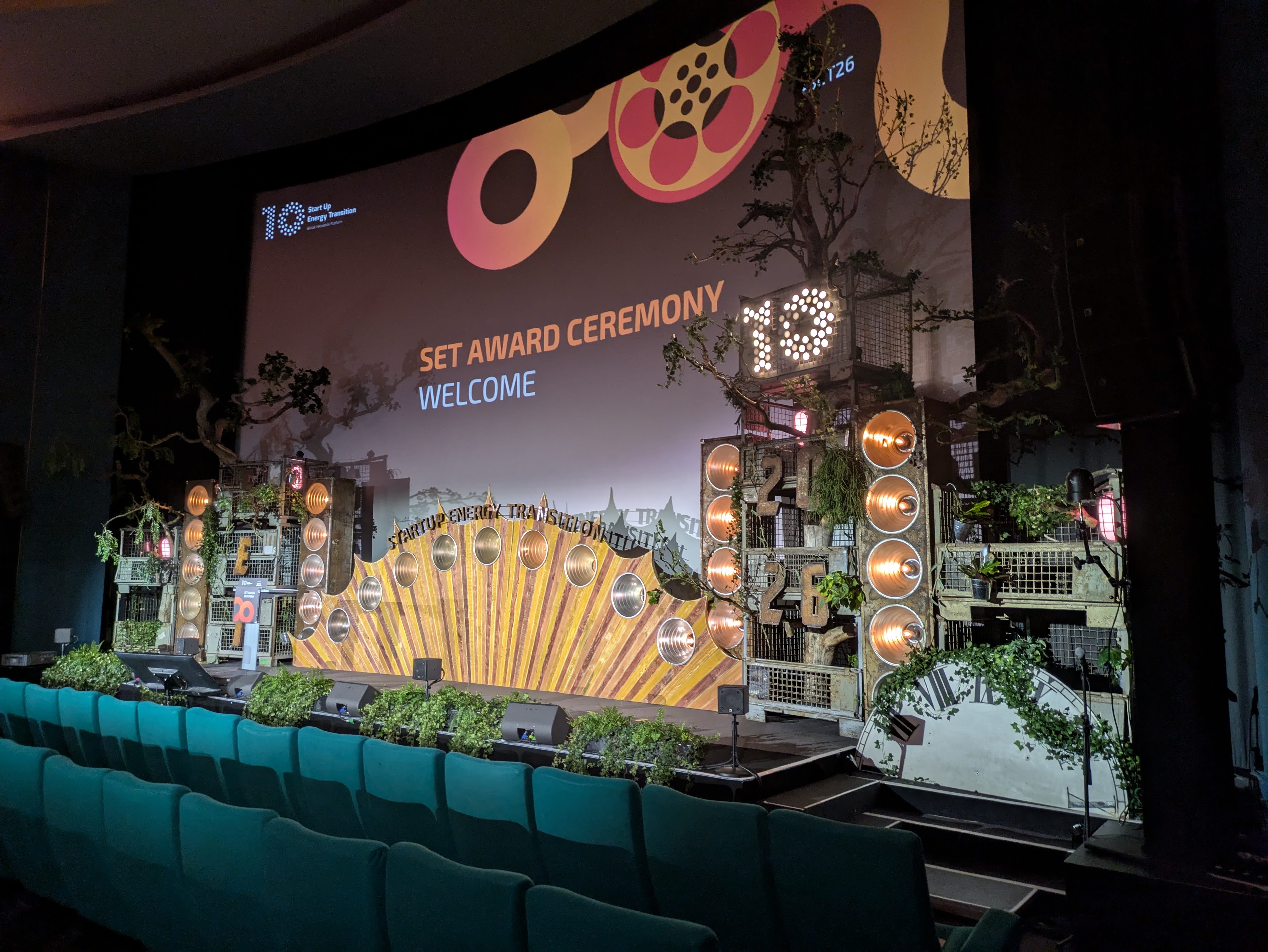 Auch im Jahr 2026 durften wir wieder die Neben- und die Hauptbühne des Start Up Energy Transition-Festivals im Colosseum Kino gestalten. Wir gingen weg von Zahnrädern und hin zu einem Schrottplatz, der mit über 6m hohen Bäumen und vielen weiteren Pflanzen "überwachsen" war. Die aufgehende Sonne wurde gerahmt von unseren Dachboden-XXL-Blindern und auch eine kleinere Version unserer Uhr fand auf der Nebenbühne wieder ihren Platz. Die funkelnde "10" unterstrich das zehnjährige Jubiläum der Preisverleihung und verlieh der rostig-industriell angehauchten Bühne ihren verdienten Glanz.