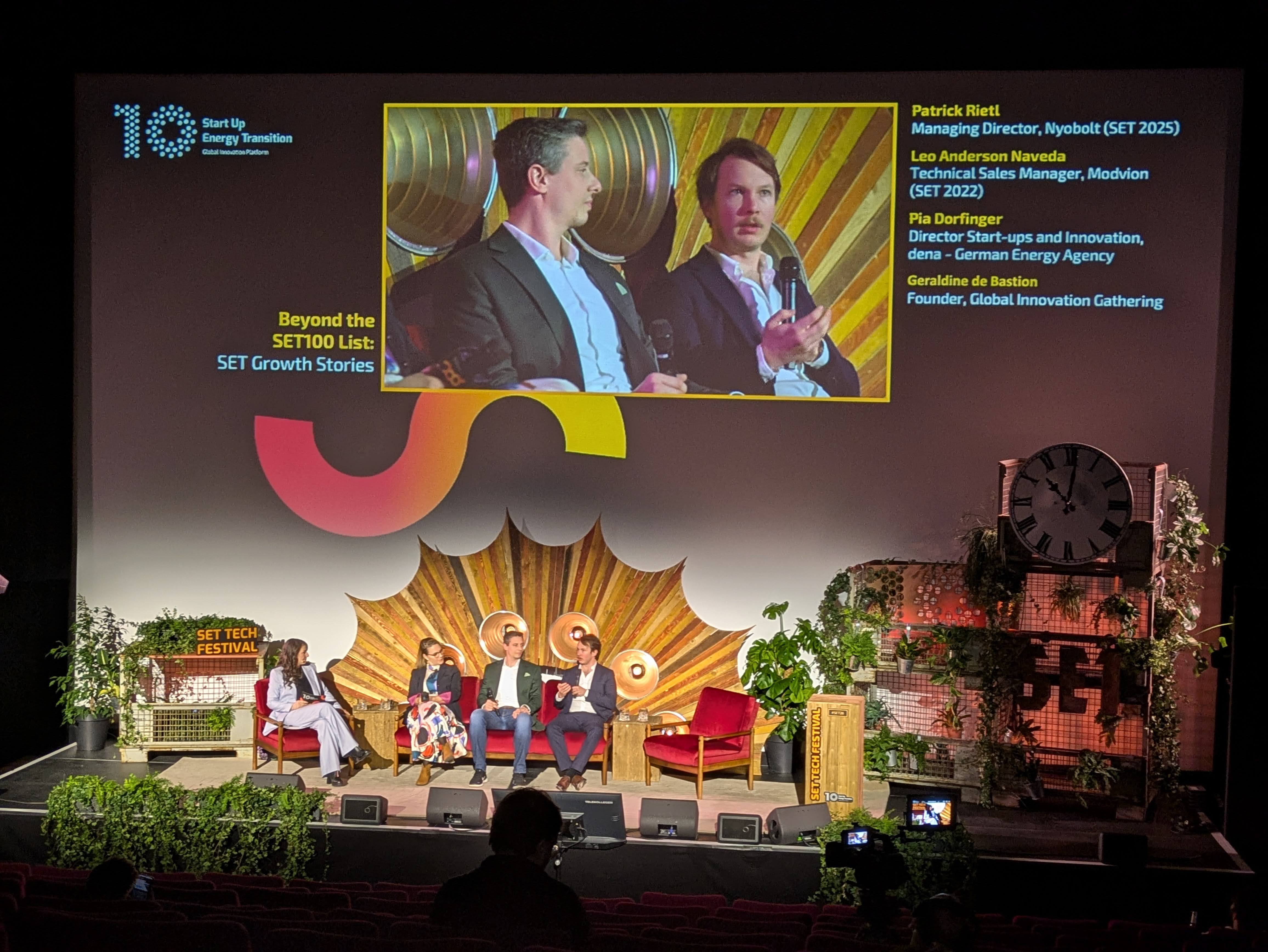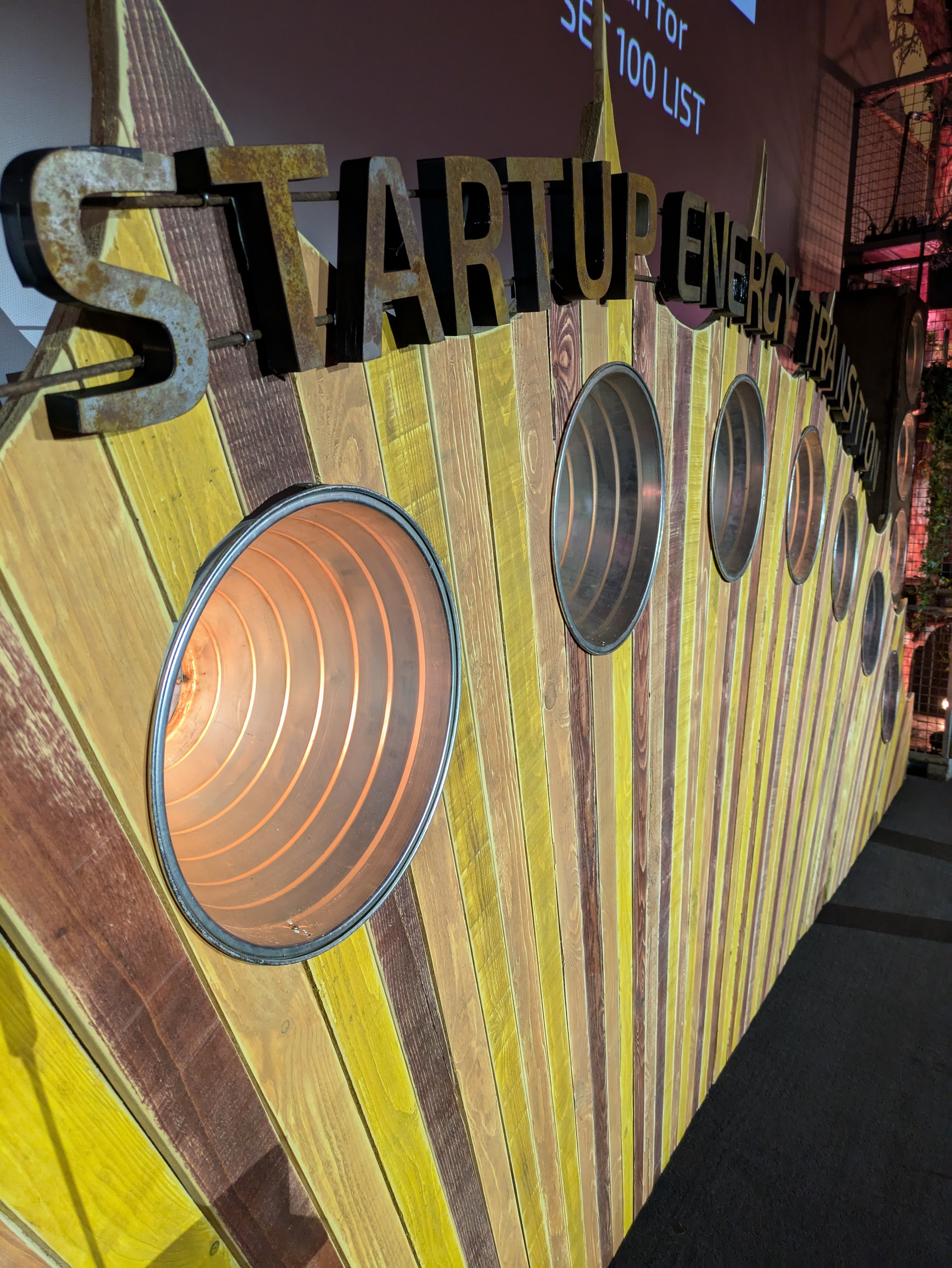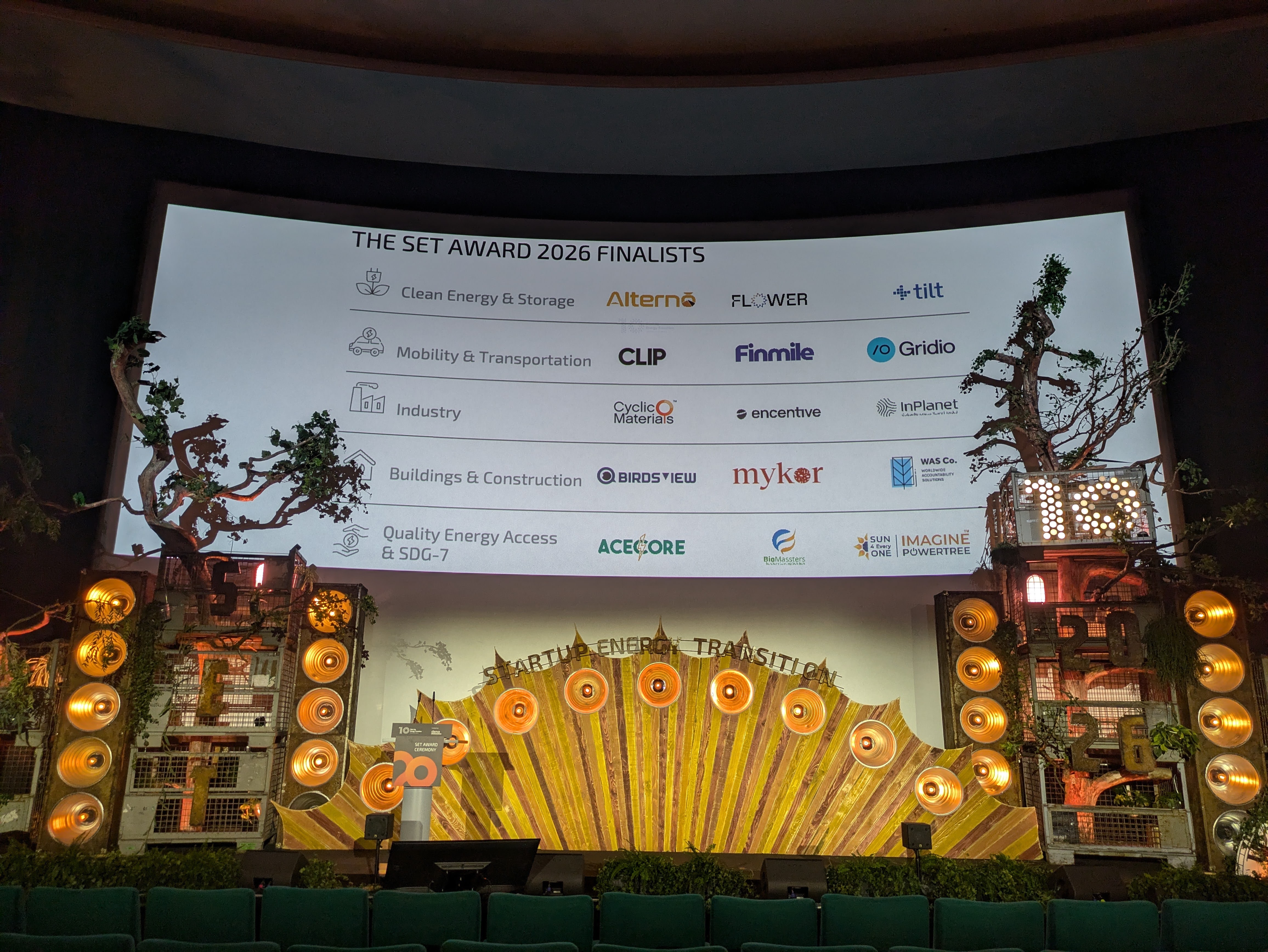 Auch im Jahr 2026 durften wir wieder die Neben- und die Hauptbühne des Start Up Energy Transition-Festivals im Colosseum Kino gestalten. Wir gingen weg von Zahnrädern und hin zu einem Schrottplatz, der mit über 6m hohen Bäumen und vielen weiteren Pflanzen "überwachsen" war. Die aufgehende Sonne wurde gerahmt von unseren Dachboden-XXL-Blindern und auch eine kleinere Version unserer Uhr fand auf der Nebenbühne wieder ihren Platz. Die funkelnde "10" unterstrich das zehnjährige Jubiläum der Preisverleihung und verlieh der rostig-industriell angehauchten Bühne ihren verdienten Glanz.