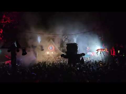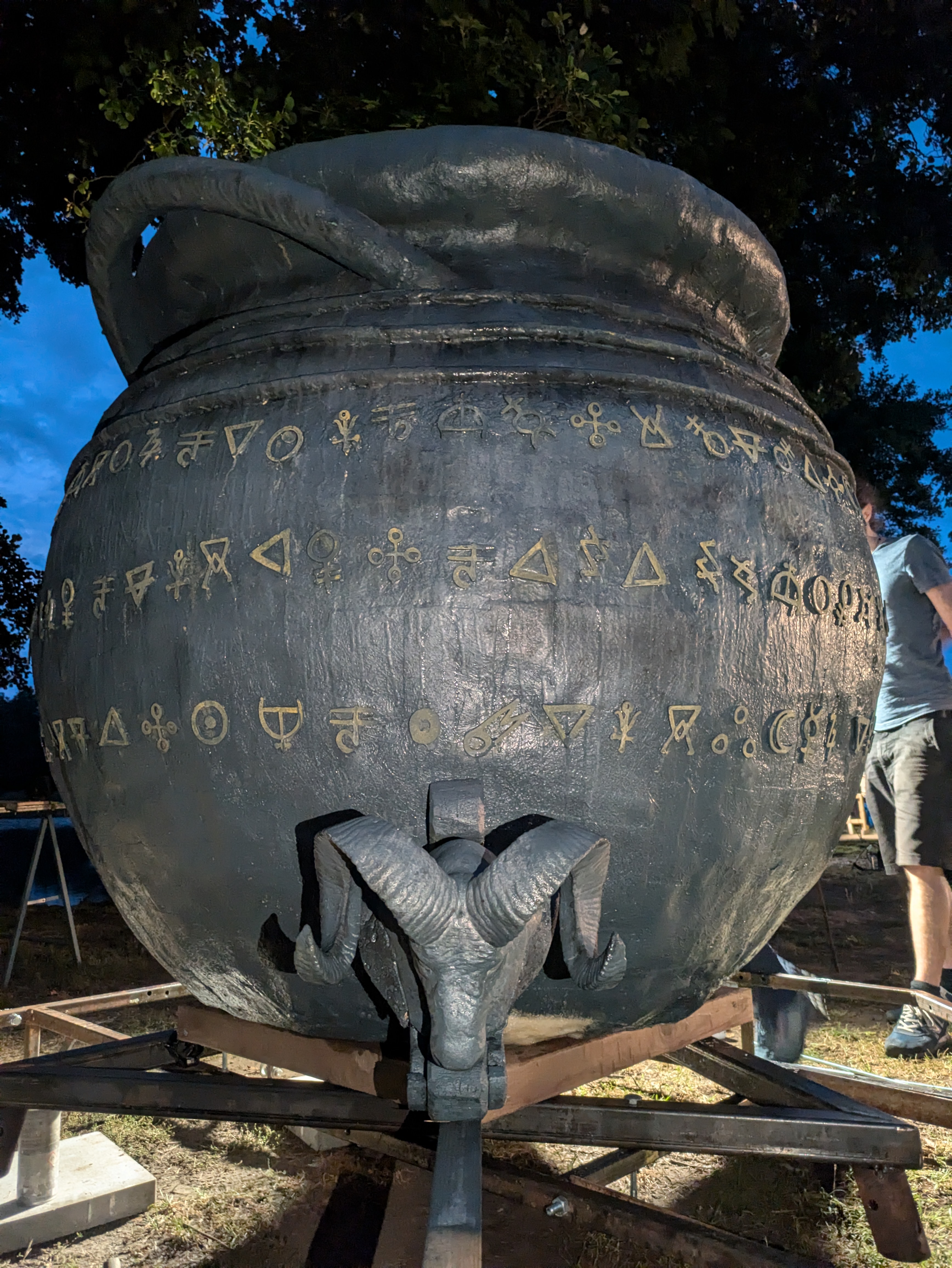 Was die Grundkonstruktion angeht, hüten wir viele Geheimnisse, aber es darf sich vergewissert werden, dass der über 4 m hohe Kessel so manche Überraschungen ausspucken kann. Wenn die richtigen Zutaten zusammengemixt werden, kann schon mal eine Feuerfontäne in die Höhe schießen oder Nebel überquellen. Doch die Zubereitung von Schaum geschieht nur in den letzten Zügen des Closings, wenn dem Kessel durch 4 Tagen ekstatischem Tanzen genug Ehre gehuldigt wurde.